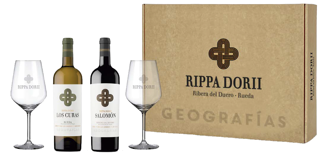 Deze Geschenkbox bevat 1 fles Rippa Dorii Los Curas Verdejo Barrique (wit), 1 fles Rippa Dorii Salomon (rood) en 2 wijnglazen